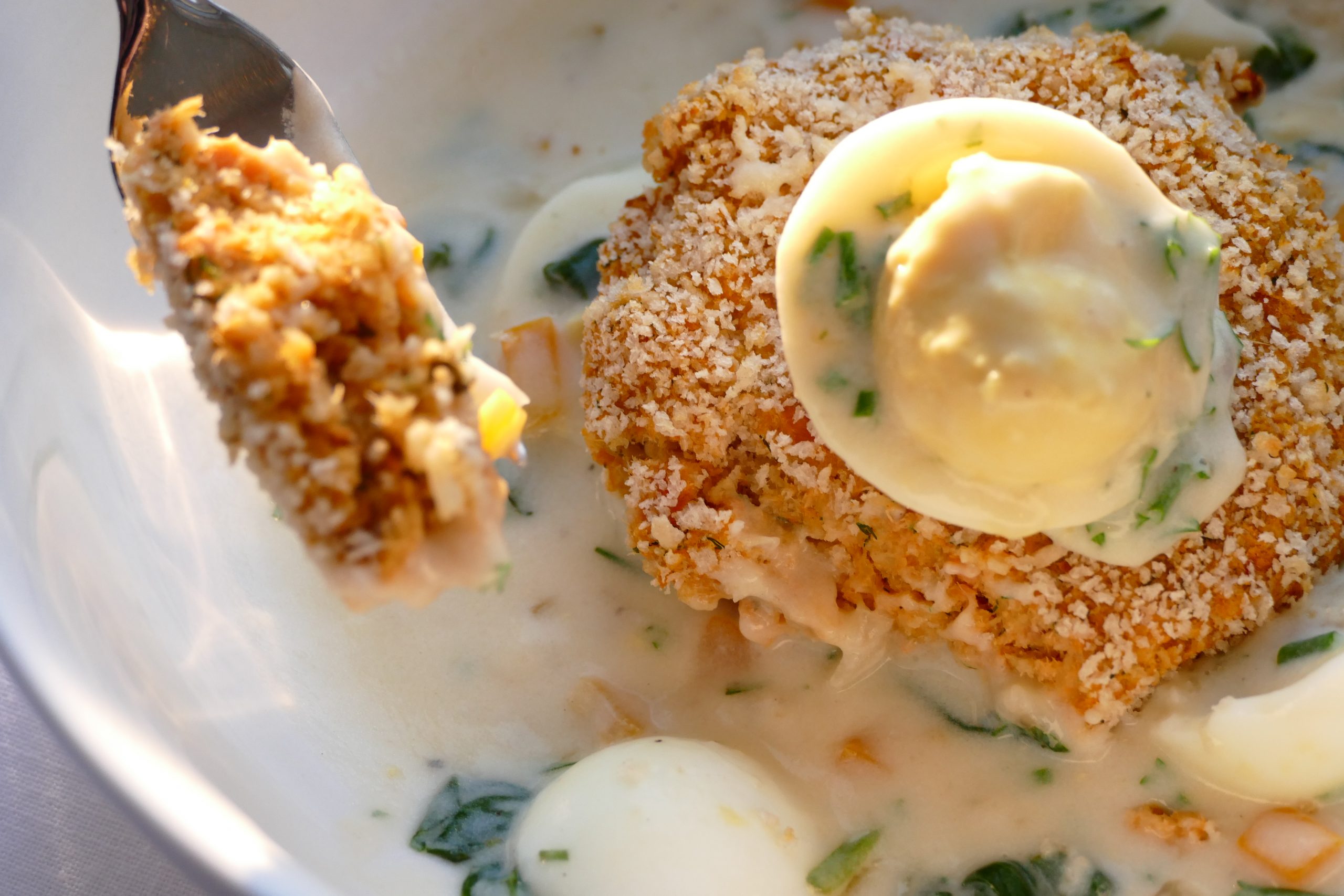 Préparation de la sauce aux oeufs. Préparez la sauce Béchamel comme indiqué ici. Dans un récipient, battez 2 jaunes d'oeuf jusqu'à l'obtention d'une crème. Ajoutez 2 c. à s. de crème fraîche, tout en battant continuellement. Incorporez ensuite la béchamel chaude, toujours en remuant, sans bouillir. Ajouter, selon le goût, le.